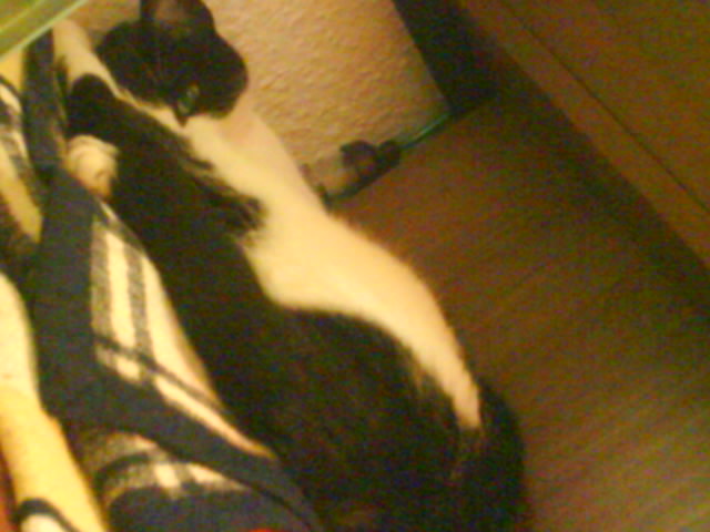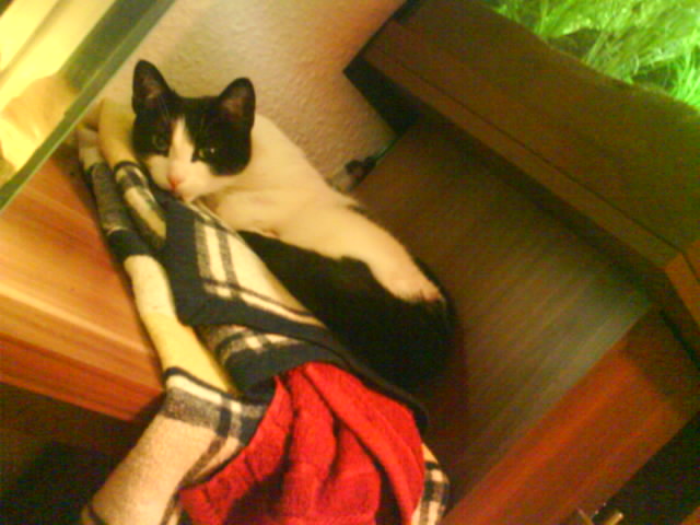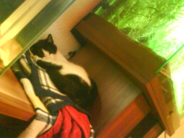 After workin on one of my Fish tanks I had as usual water all around and near the Fish tank because it drops everywhere when I take my hand out of them. So I have to clean up after working there. This is why I have some towels there. Yesterday I was to lazy to take the towels to the washer. My cat maybe thought “Wooow.. nice place there between two fish tanks” and laid down on the towels.