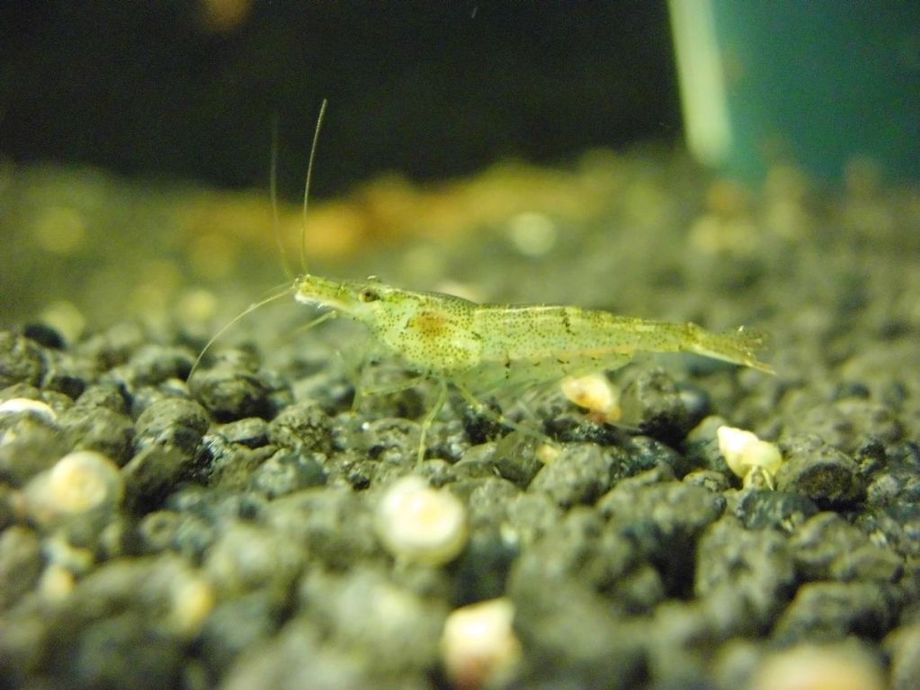 This is a Photo of a Shrimp in my Fish Tank. I bought round about 14 Red Fire Shrimps some time ago and they all were red in color. This Shrimp seems to be the Brood and I wonder why some aren´t red. I think they either become red soon or the Offspring is going back to their natural look. I did read that these Shrimps are overbred and their red color isn´t natural. It´s overbred.