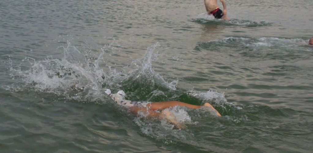 But I also did know once I go in there and swimm, my Body will warm up because of the movements. And well I was more sick of the muggy Weather then afraid of the refreshment in the Sea. We just jumped in and started to swimm and play while my Mother took some Photos of her Husband, his Son and me…