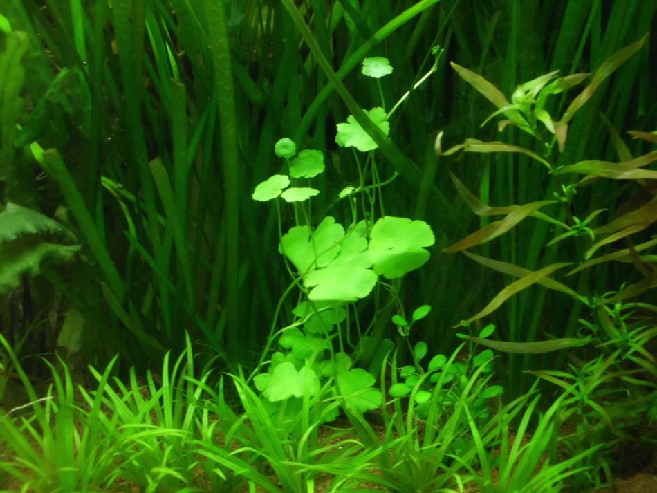 I cant give you the Name of the Plant on the right. I am not sure. And also not the Name of the lonely Plant in the Middle. But the Plant in the Middle likes to grow on the Water Surface. I did not know this, at the Time when I took the Photo. I had no success when the Plant was implanted in the Gravel. The Plant just started to float someday and was growing pretty fast on the Water Surface. The funny thing is that this Plant grows out of the Water Surface. It looks cool and you can smell them. They smeel of Herbal.
