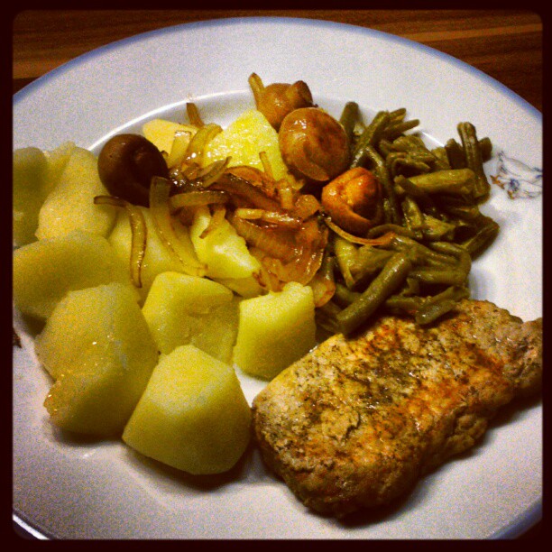 I visited my Mother today and I came to the right Time because her Husband did cook. They then asked me if I want to eat something too. I indeed couldn´t say no. 😉 He cooked Potatoes with String Beans, Onions, Mushrooms (Champignons) and Pork Steak. It was pretty tasty, however I missed a Sauce. I prefer eating most Things with Sauce. While I know they and a lot of other People eat the mentioned Dish above without Sauce. I still liked it too. I especially love Mushrooms pretty much!
