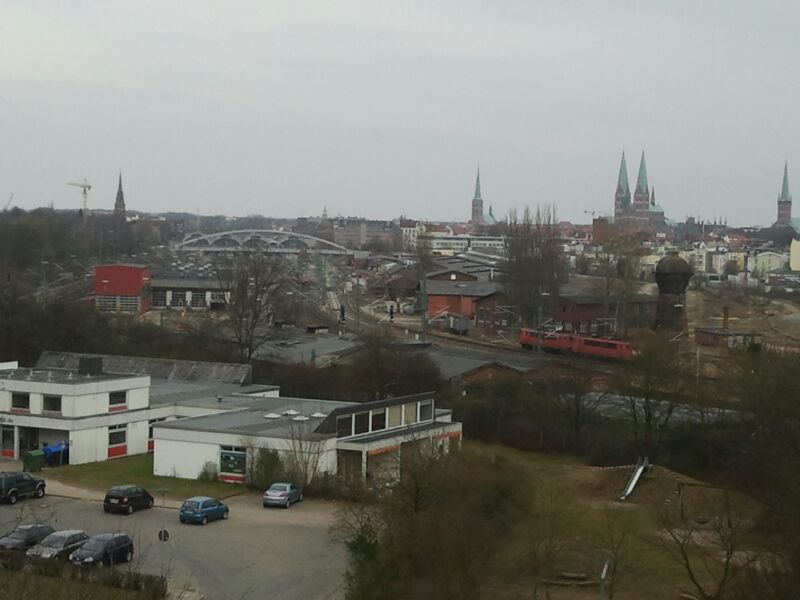 What you can see on the image, is a small part of Lübeck´s skyline. There is one old freight depot on the right side of the bridge and I took a photo some time ago. You can´t see it but in the direction behind the bridge is the train station of Lübeck. On the photo are also some of the seven bigger church towers of Lübeck, which are part of the townscape and seen on some lubeckian company Logos for example. Schwartauer Werke is for example one of those company’s. They have the seven church towers of Lübeck in their logo and they do create jelly and I think they are also international known. At least in some european country’s I heard.