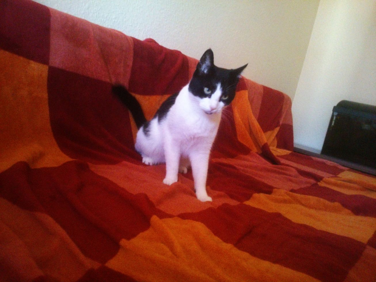 I took this photo days after the refurbishment of my living room. This is my couch and the new red toned blankets. Kitty Shyna does really like this cozy place. 🙂