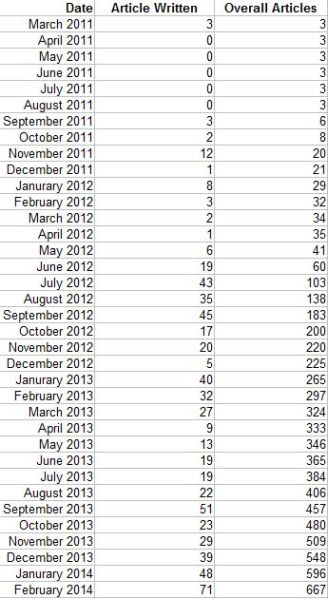 Overall, in the 36 month period from March 2011 to February 2014, I published 667 blog articles. This is an average of 18.53 monthly published articles over the time span of three years. Now that I finished this article, I forgot why… but it might be interesting to check out next year, if I see the next “Happy Anniversary” badge. 😀