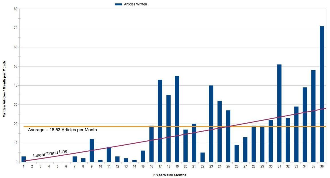 I started to get more interested in blogging from June 2012 on, the eighteenth month of blogging. At this time, I topped the highest number from the earlier period with 19 published articles. I am not sure what did hit me in July 2012, the nineteenth month, but I thought I needed to double the publishing interval and finished the month with 43 articles. From this time on I did publish with exceptions usually so much articles like a month had days. To be exact, a monthly average amount of 29.81 articles. But sometimes I became crazy and topped all the months before with over 40 articles and ended the February 2014 even with 71 new articles. This paragraph here is the timeframe where I fell in love with blogging.
