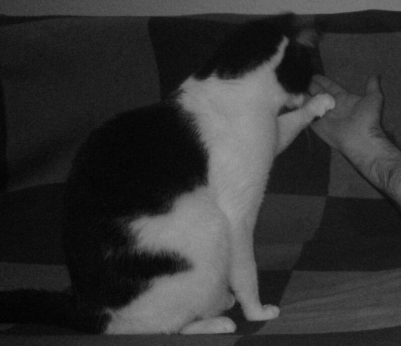 The image above is some months old and in bad quality but it shows how Shyna gives me a handshake. This is just another trick I tought her. I usually say “Give me five” in German, while showing my hand vertical near her paws, and then she does give me her paws.