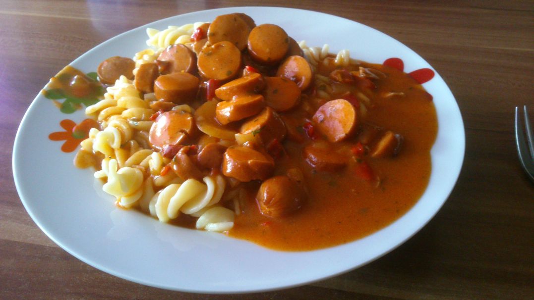 You could also create your own sauce but the instant powder is really very tasty in my opinion. The company Maggi calls the sauce powder “Würstchen Gulash” (sausage goulash) but I guess this sauce is for the german marked, I am not sure. Yea, it´s fast food but still very tasty.