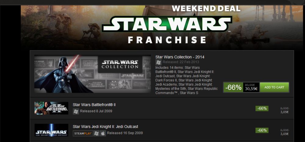 Steam runs a Weekend Deal with the Star Wars Franchise at the moment. You can get a lot of Star Wars games heavily price reduces and up to 66% off. You can either grab single games or you buy the complete Star Wars collection 2014. Here is the complete offer list.