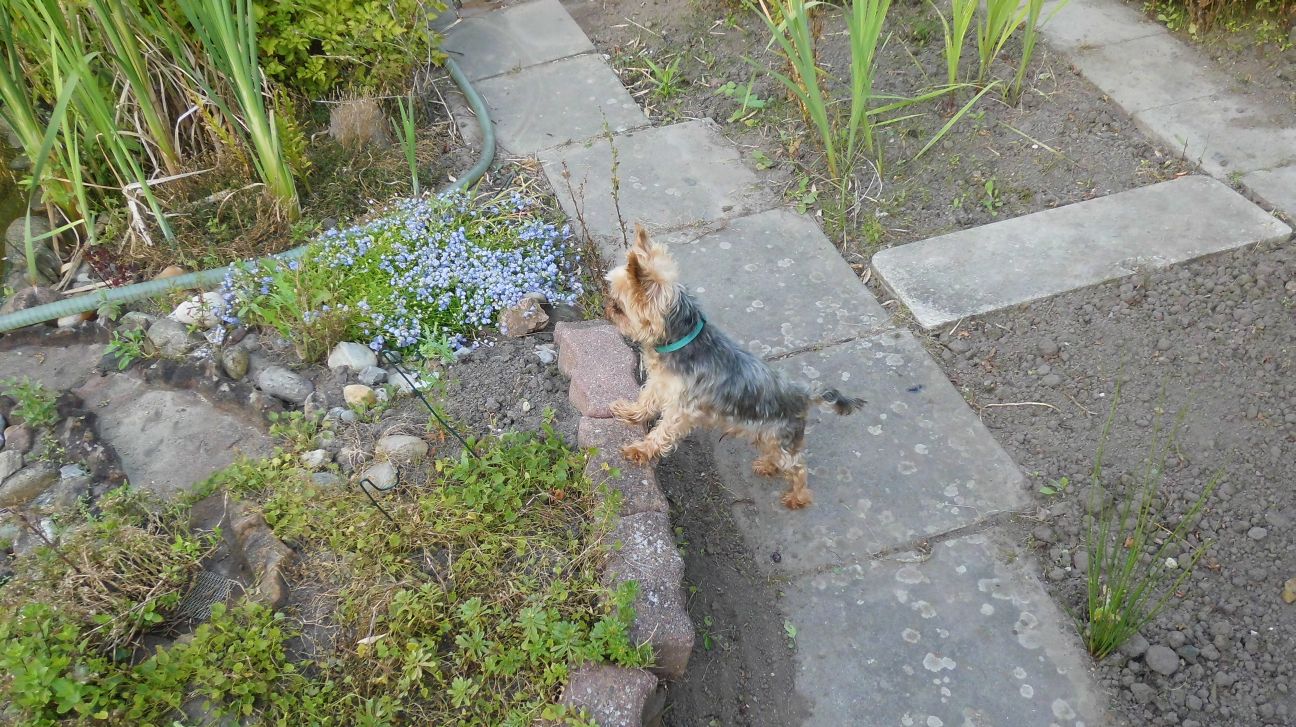 But let me start with some garden images now anyway. Here you can see the dog of my mother and her husband. Billy seems to enjoy the garden too. Here he looks into the pond because he noticed the fishes…