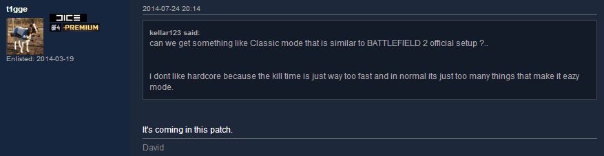The developer answered the Battlefield 4 player question “Can we get something like Classic mode that is similar to Battlefield 2…?” with “It´s coming in this patch.”
