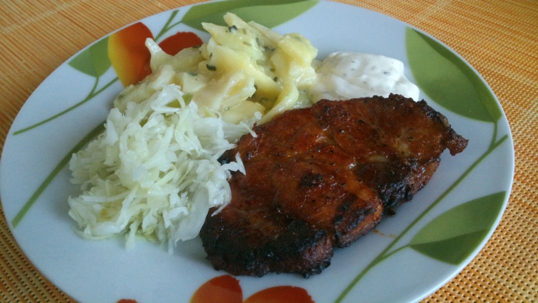 Above you can see a very typical German barbecue combination. Not that every German barbecue plate would look like the one on the photo, but I´d say you would at least always find sauerkraut and potato salad on the table, and meat or other things for sure. I used garlic dip and herb butter to make my steak even more delicious.