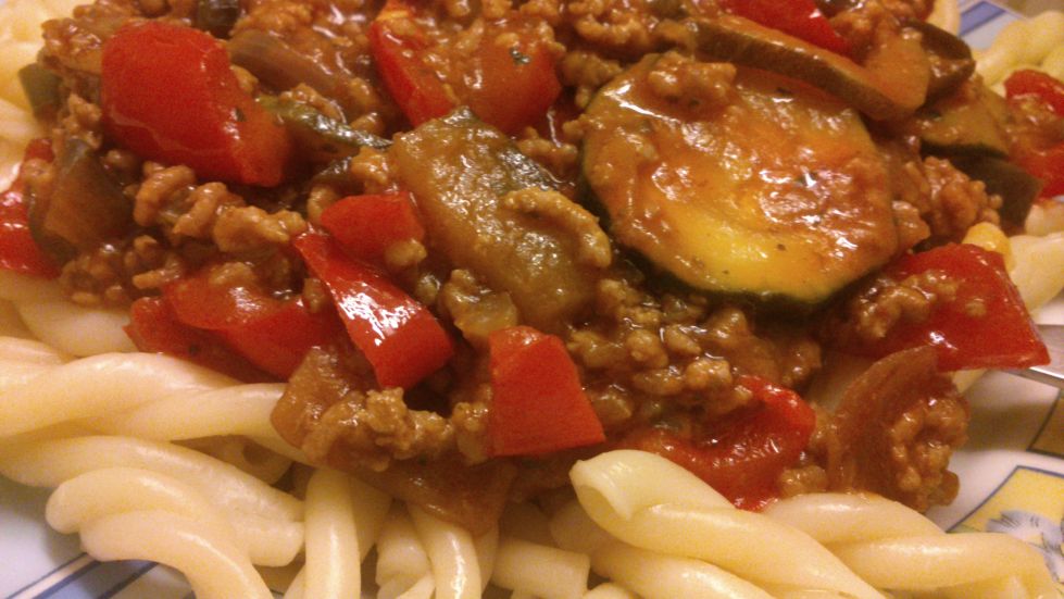 There are certain things that I like and that do totally fit to pasta and bolognese sauce in my opinion. Of course, onions and paprika can’t be absent, but I still would say this is standard for spaghetti or pasta bolognese. No, what I additionally love to use is zucchini, egg plants and chili peppers. I usually ask for very spicy chili peppers but then I do also not use more than two of them. I love the combination of vegetables I mentioned, I really love it because this goes so well together with the bolognese sauce, the noodles and the minced meat, that I totally get excited when I eat that.
