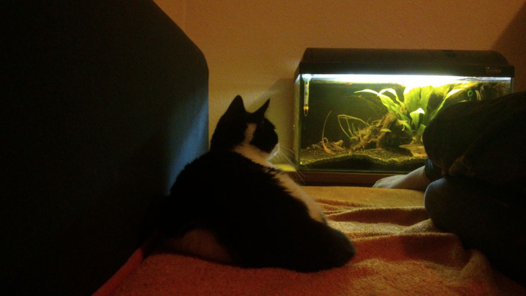 Above you can see my smaller fish tank when this thing was still ok. Back then, me and my cat enjoyed to chill out on the couch near the fish tank in the evening because the lights of the fish tank were really relaxing. We both enjoyed it.