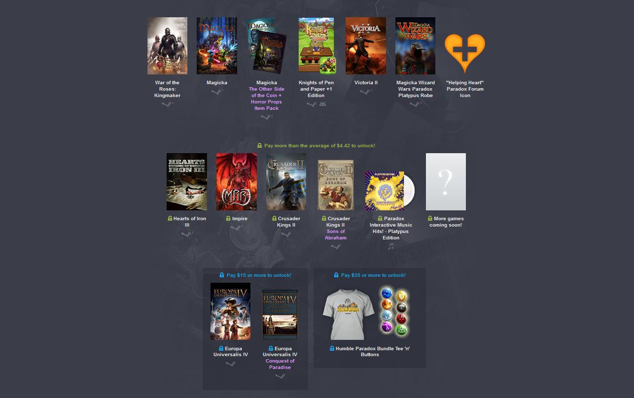 Now you can also spend a little more, if you spend the average amount of all players (you find that amount on the site), you will get additional games to all others I mentioned. If you spend the average amount (by the time I write this it’s around $4.40 but it’ll change over time), you get the games Impire, Crusader Kings 2 plus some extra content and Hearts of Iron III. Additionally you will get a game that will be revealed later on.