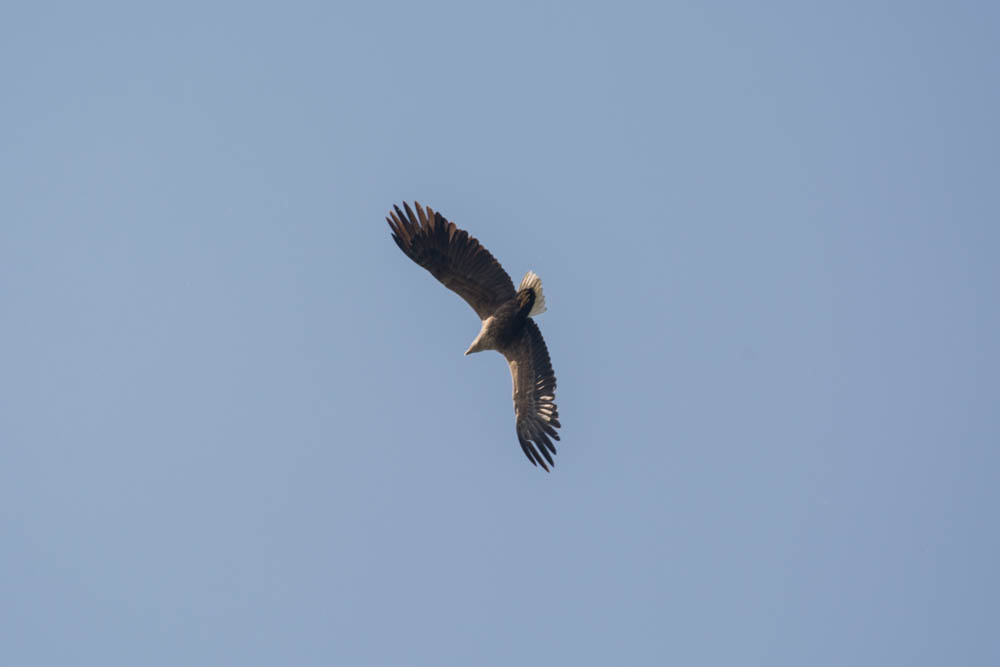 When I saw the small point in the air, I was not interested at first, but a second later I noticed that it must be an eagle and my full attention was there. When I saw white-tailed eagles (Haliaeetus albicilla) in the past, they rather had a grey neck or they were completely brown, and when I saw my photos at home, I thought the bird also looked like the American bald eagle (Haliaeetus leucocephalus). However, I found out that the older white-tailed eagles look very similar, the younger ones not, and that the eagles like other birds can have different plumage. But then I have read that there were two cases of bald eagles gone astray, two sightings of this bird in Germany, so, you never know, unless you are a bird expert. Anyway, it’s probably very unlikely, and since older white-tailed eagles look so similar, it’s probably our domestic eagle.