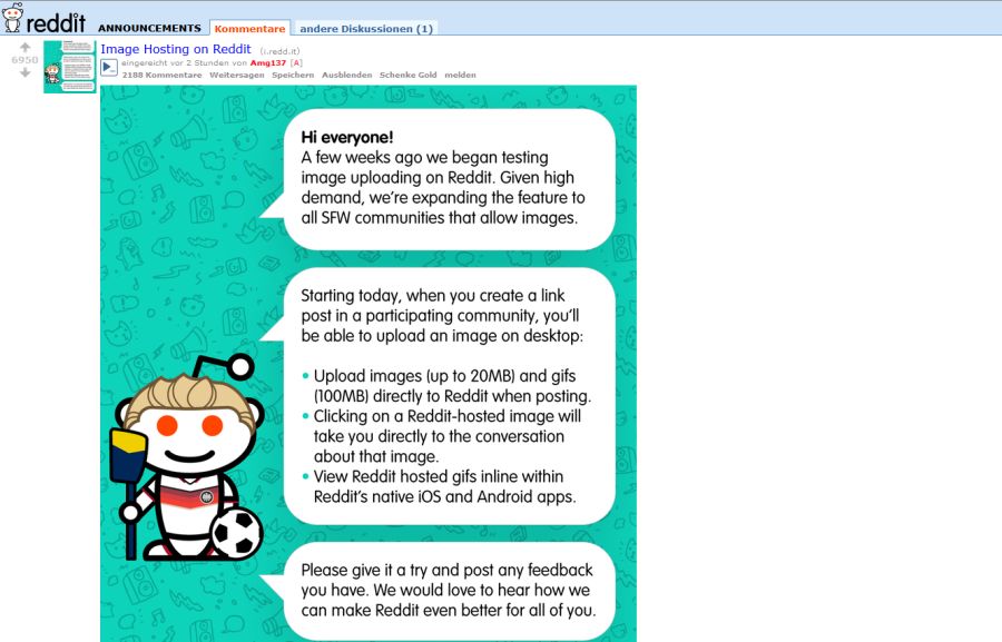 This here is an interesting news for Reddit users. Reddit started to experiment with image hosting a while ago, it was possible to upload images in some subreddit communities. Today they announced that the feature will now be expanded to all other safe for work communities due to the fact that there is high demand. So, since today the feature is fully integrated in all other communities that are safe for work. Starting today you will be able to upload images of up to 20 MB or gif files of up to 100 MB. Check this link to see how it looks in action, or try it out right away on Reddit.