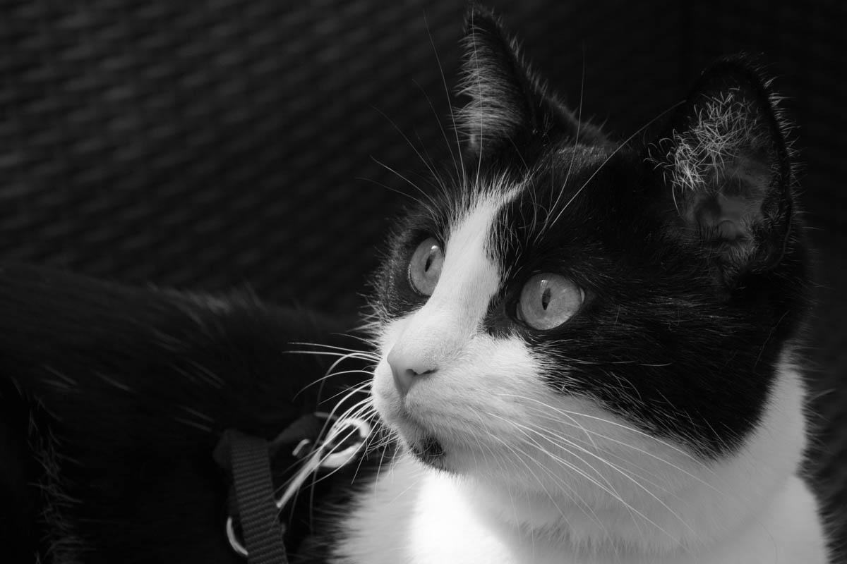 Here is yet again a photo of my cat Shyna. The photo was taken when I still was in Reinfeld, we shot the photo on the terrace as I had her on a leash. I edited the photo with Lightroom, I wanted to crop it a bit, I made changed to the tone curve and converted the image to black and white as I was not happy with the overblown highlights. My cat is always photogenic, it’s no rocket science to take pictures of her, because she will like all cats just look good.