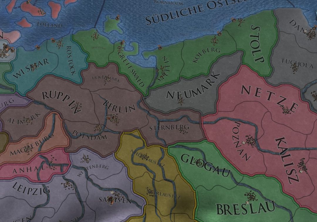 At the game start there are several challenges with this combination. We knew, our most important goal would be to border each other, because that is not the case in the year 1444 of the game, but it’s very essential to help each other with troops in future wars. One of his Teutonic Order provinces in the west was not bordering the rest of his provinces, it was basically split by Pomerania. Seen from this single province, there would be Brandenburg between us, another German nation. Poland and Lithuania was a difficulty too, they were close to us, and you don’t want to get in trouble with them when you are still little.