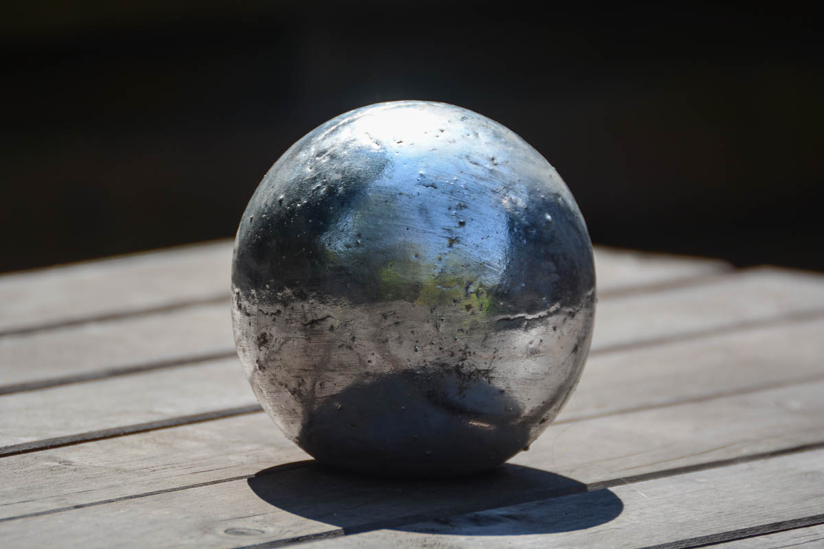 They had different things places in the front yard as decoration, like sculptures and so. Maybe the person was into art and decorated the yard in a minimalist style. The silver ball is beautiful and simple.