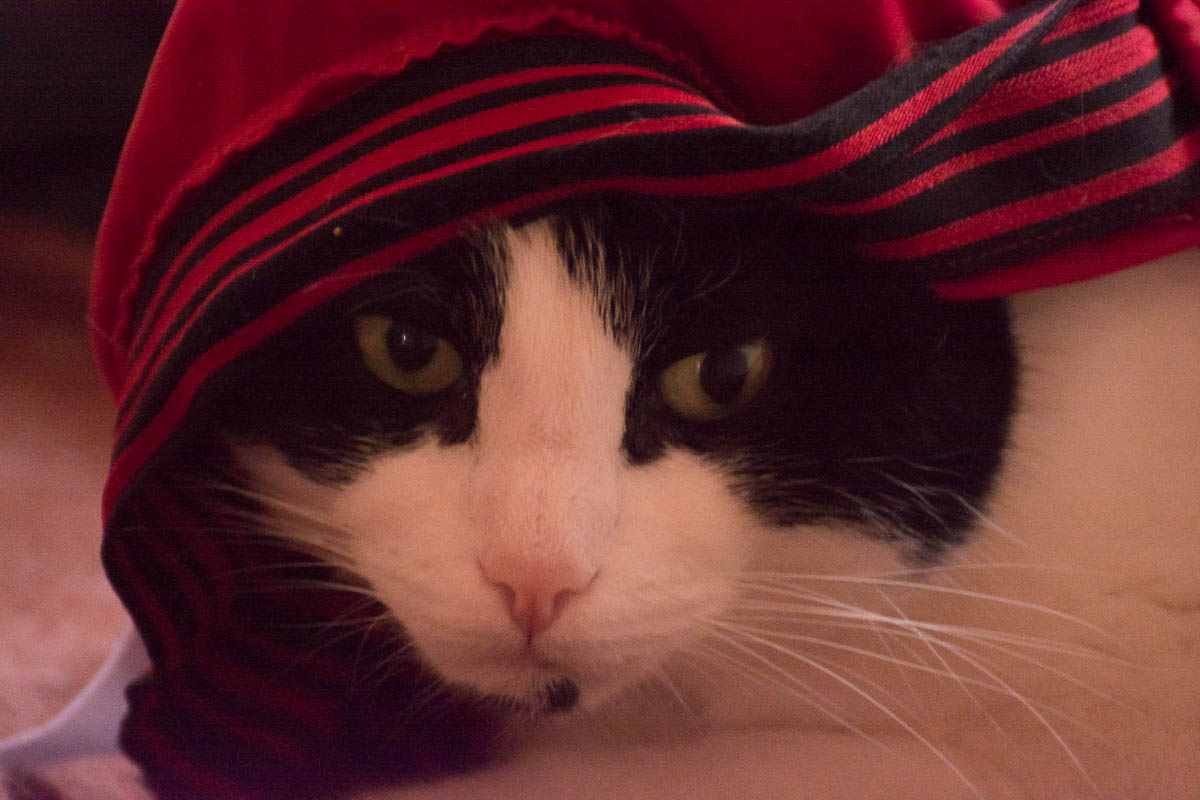 I am alone and since I do laundry regularly, I don’t collect much there. But anyway, as a cat person I should know better, and yes I found cat hairs, especially on my dark shirts so that I started to put them into a bag in the cabinet before laundry. What I however didn’t expect was that my cat would think that my small laundry mountain on the bed is something like a fashion wardrobe. And really, it’s not staged. Some days ago when I entered my bedroom, I saw Shyna on the bed next to the dirty laundry and she was wearing one of my boxer shorts as a hat. I wanted to laugh hard, but then I thought it would be better to get my camera and take a snapshot…