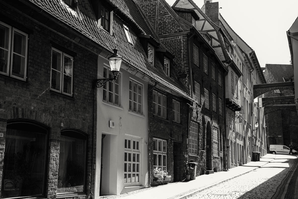 Above you can see a small alley or street in the historic district of Lübeck. It’s the most interesting district in our city because there you can still find old construction styles. In other words, you find a lot of buildings with brick stone. First I wanted to upload the photo in color, but it was shot in JPG and the image contained overblown highlights so that I decided to convert it to black and white. But that’s not bad either, because I love black and white photos and it works with the photo above as well.