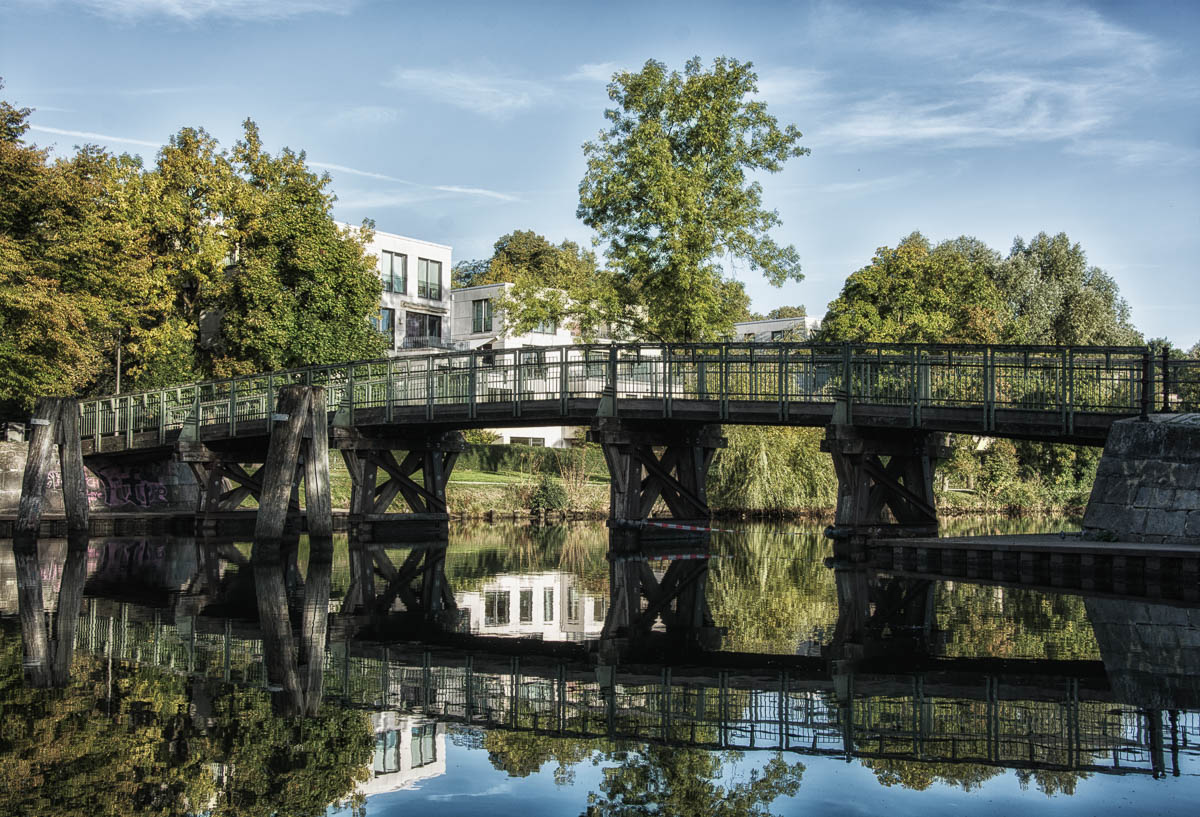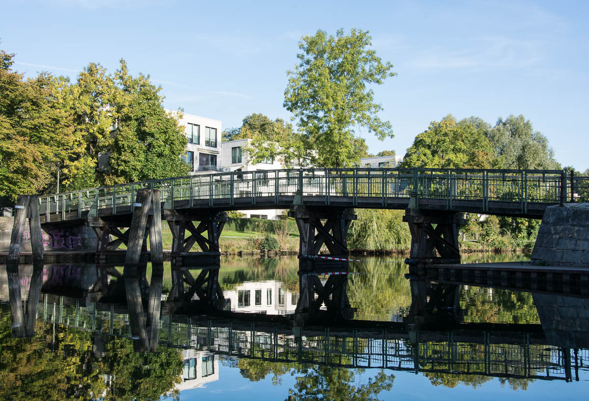 I thought I do one of this before and after editing posts again. But as always I show you the edited photo first and the bad one last. I found the picture above in my library and I shot the photo somewhere in Lübeck two months ago. The bridge in the scene is there so that people can cross the channel. That’s possible at different points around the historic district, because we have different bridges for pedestrians but also for cars. The historic district of Lübeck is basically an island enclosed by the Trave, that’s why these bridges are so important. If you go from right to left in the photo, you’re basically leaving the old district and island. That’s also why you see these modern white structures there. I like to take photos of bridges, I don’t know why, maybe it’s the shape and sometimes also the fact that I like how they reflect in the water. But now let’s see how the image looked before I started editing it…