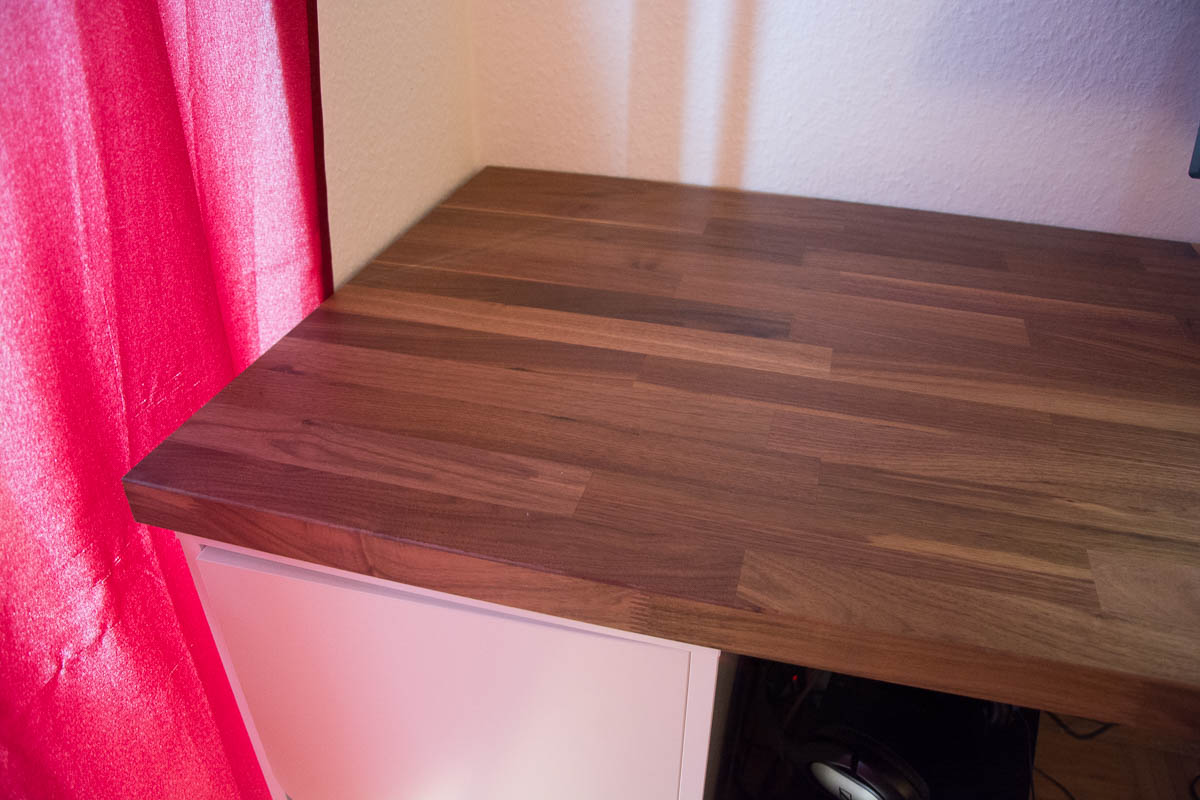 It all started when I saw some guys on YouTube putting small cupboards from Ikea together. I am talking about the white Alex cupboards, they’re cool because they come with a measurement that allows you to use most uncut kitchen countertops or solid-wood boards. I found different ideas on YouTube, no matter if cut or uncut wood. I considered solid-wood boards and went into a DIY store but I disliked the raw surface of those boards or the idea to refine and stain the wood in my apartment. But then I saw someone using a finished kitchen countertop from Ikea. The countertop is called Karlby and I realized I could get it in walnut, which was great because most of the things in my living room are in walnut, not to mention that I love this wood color. So, I went to Ikea and purchased the 186 cm long Karlby countertop and the Alex cupboards. The next day I started putting everything together.