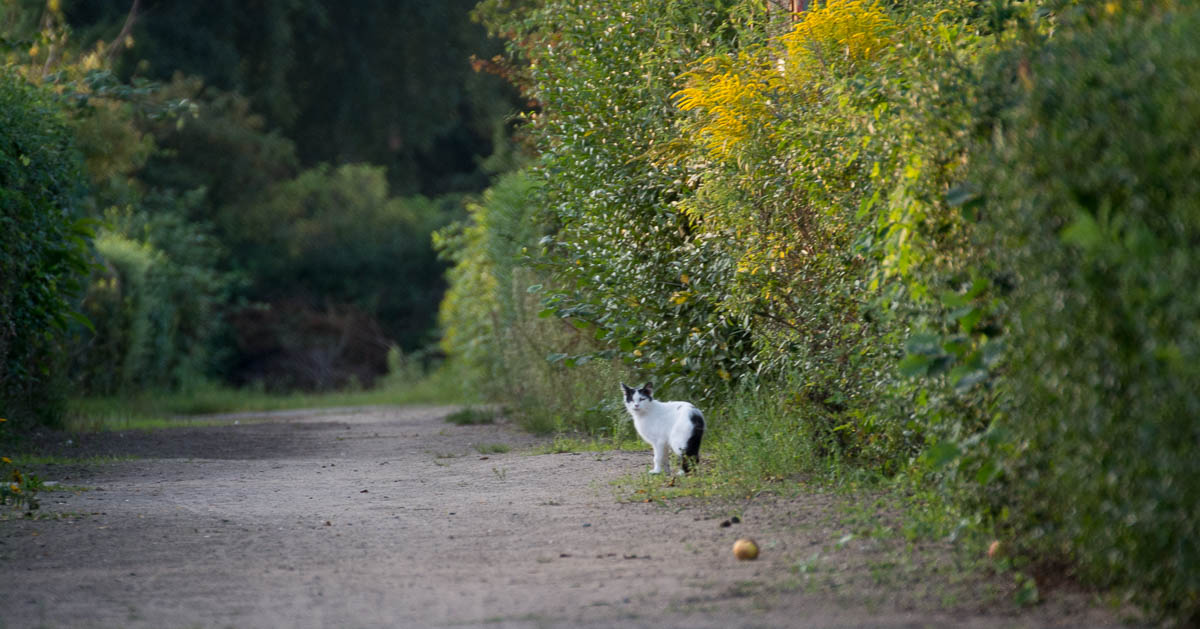 Today I challenged myself again to take new cat photos. The garden areas are great for that. I already tried the same yesterday and I got a really nice close-up photo of a beautiful ginger cat. But that doesn’t always work because not all cats let you come close and my 70-300mm lens won’t help me either if I am too far away. Some cats are shy or cautious and prefer it if you keep your distance. I found one that absolutely didn’t want me to come closer. I got a photo, but it was shot from the distance and the cat simply disappeared in the shrubbery. The photo below shows the cat, and it’s actually a cropped image, which means the cat really wanted to avoid me…