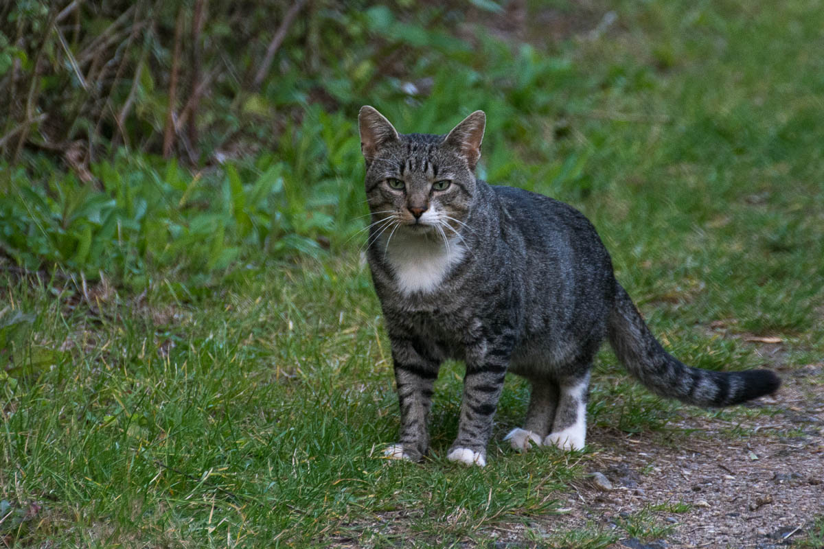 Here is another tabby cat I found. I walked this path and then there was this junction and the cat really didn’t expect to see me and froze for a moment. I had at least 30 seconds to get the photo right, which means this cat was less shy than some of the other cats I photographed but not brave enough to come much closer. Like many of the cats there, it preferred to run into the thicket.