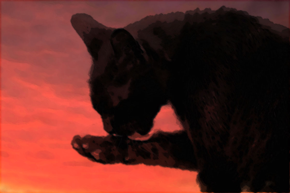 The image at the top is basically the result of experimenting with one of my cat photos. As I’ve done a few times recently, I went for the digital painting look again. First I used effects to limit the number of colors in the fur, basically resulting in an almost entirely black cat. But I also did use selections to cut out the cat. I’ve done that because I wondered how it would look like if I would replace the background. I’ve used a photo with clouds but gave it a more red appearance. So, that’s basically how I’ve done it. Here is the original photo but in black and white…