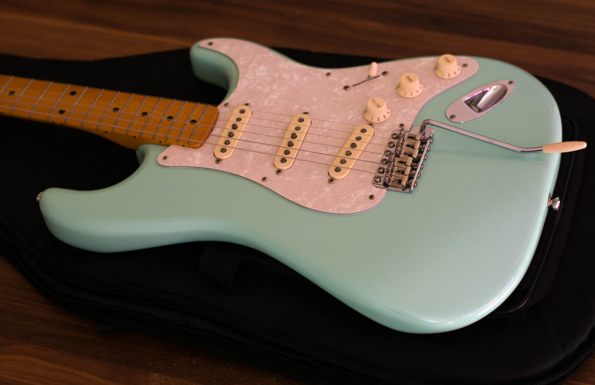 I just found this photo in my library and while I already uploaded photos of that guitar in the past, it would be a waste to delete additional photos I have. This guitar is a Fender Classic Series 50’s Stratocaster and the color of it is called surf green. Some of you might already have seen the video but for others who have not and who are wondering how the guitar sounds like, here is a video I recorded while playing the guitar…
