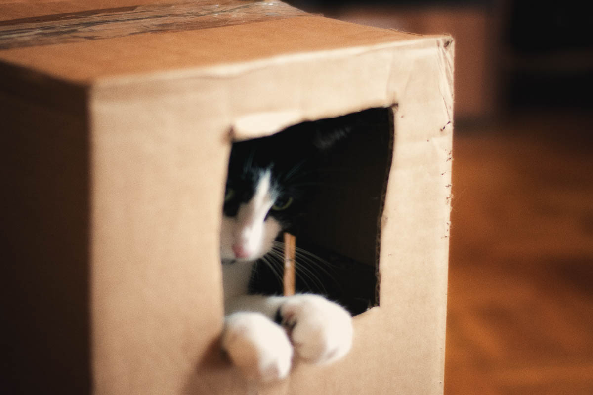 Like always, I did let my cat use the cardboard box of my online delivery. But it seems like she got bored of it after three days. I then used duct tape to seal the box and cut a smaller hole in it. Immediately, she became interested again. I can place the cardboard box differently, for varied fun. In the photo at the top, I placed the box upright and as you can see, she went in there and looked out of the hole. I shot a whole set of photos of her today while we played with the box. So, I have some more for future uploads.