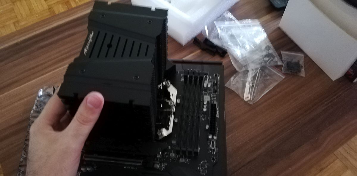 Next, I did put the CPU cooler on the bare CPU socket. Nope, I didn’t attach it to the brackets, I did just put it on there for a test, to see how much clearance I would have. That’s it. The thing is, I am building PC’s since I don’t know, 30 years maybe. So, out of experience, you’re better prepared and know what you work with. The most practical way to put things together is by doing it outside of the case, however, you don’t want to get a surprise later on when you shove the stuff into the case. I am talking about surprises like “Damn, I can not reach this screw” or “Oopsie, how am I supposed to plug in that cable now?”.