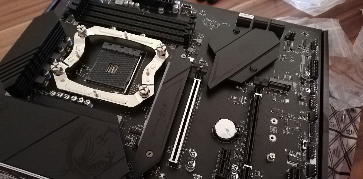 The photo at the top shows my MSI B550 Gaming Plus mainboard after further preparation. It’s a gorgeous mainboard as it is entirely black. However, I won’t see much of it later when the PC is built because even if my I have choosen a PC case with a tempered glass side, it’s a dark tempered glass and won’t show a lot except RGB LED’s maybe. Anyway, I already have a CPU cooler here too, so I started to prepare the mainboard for it. I removed the standard mounting kit from my board and added the backplate and bracked of my Alpenfön Brocken 3 cooler. It’s the silver frame surrounding the CPU socket as you can see in the image at the top.
